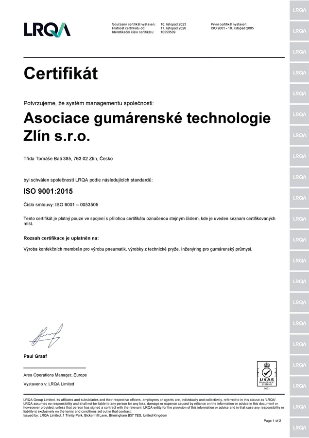 Společnost Asociace gumárenské technologie Zlín s. r. o., IČ 60749555 byla založena 14. dubna 1995 skupinou gumárenských a pneumatikářských specialistů, kteří předtím pracovali dlouhá léta ve výzkumu, vývoji a výrobě v tuzemsku i v zahraničí.